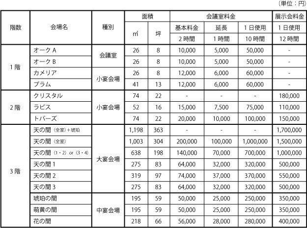 ※上記宴会場使用料金に別途、消費税及び10%のサービス料を加算させていただきます。