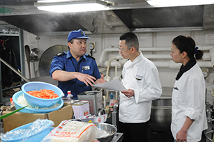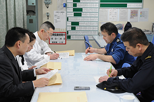 ソーニョの加藤料理長を含むホテルスタッフが護衛艦いせにてカレーについての説明を受け、実際に厨房内にて加藤料理長が食材や「いせカレー」の味についての指導を受けました。