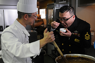 護衛艦いせの調理長がクレイトンベイホテル・ソーニョに来館され、カレーの技術的な指導及び味の確認を行いました。