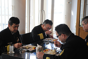 護衛艦いせ艦長 ・ 一等海佐 藤原秀幸様がソーニョに来店され、カレーの試食を行いました。