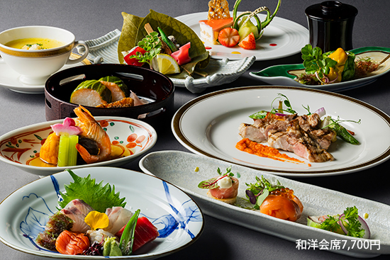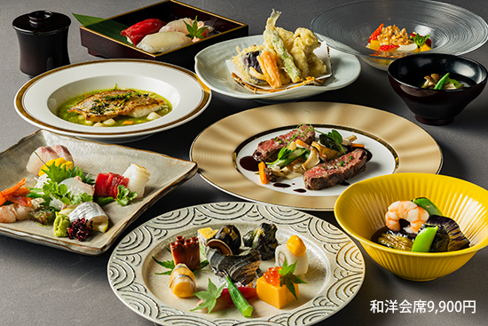 季節の食材を吟味し和食の繊細さと洋食の華やかさが広がる和洋会席及び、和の匠の技を尽くし、季節折々の旬の食材を大切にした和会席よりお選びいただけます。